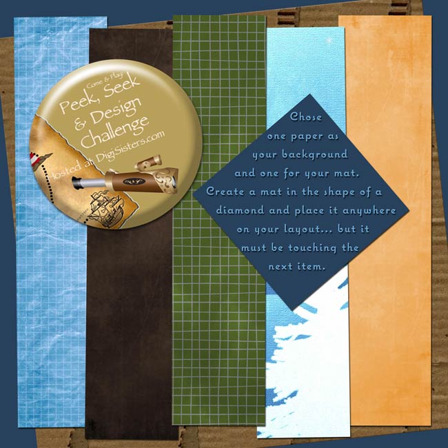 Your challenge is to chose one paper as your background and one for your mat. Create a mat in the shape of a diamond and place it anywhere on your layout... but it must be touching the next item.